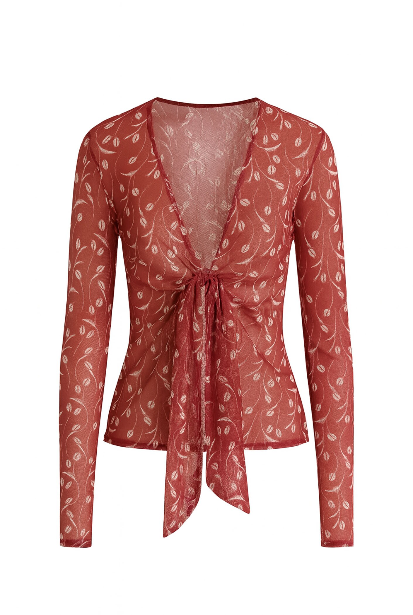 Blusa confeccionada em tule, com estampa exclusiva, mangas longas e amarração frontal.